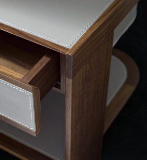 Прикроватная тумбочка из массива ореха canaletto и отделке из кожи или кожи cuoio.