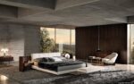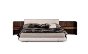 Кровать Brasilia из окрашенного в темно-коричневый цвет палисандра Сантос или дуба с открытыми порами и шпоном, окрашенным в медовый цвет, отличается рифленым изголовьем и заканчивается двумя прикроватными тумбочками, по одной с каждой стороны.