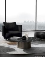 Журнальный столик Doyle, вдохновленный атмосферой лаунжа середины века, состоит из круглой столешницы толщиной 20 мм с закругленными краями.