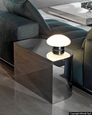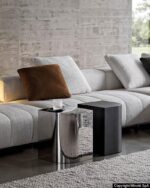 Журнальный столик James выделяется своей скульптурной формой: монолит из лакричного ясеня или из полированной стали с зеркальной отделкой.