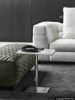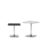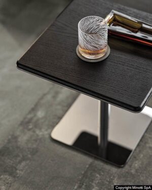 Журнальный столик Kyle имеет металлическую раму с хромированной отделкой, которая вмещает квадратную столешницу с закругленными углами и гладкими краями.