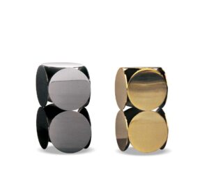 Структура- латунные прутки, Ø 16 мм, приварены друг к другу. Отделка глянцевая бронзовая краска, полированная медь, полированный черный никель. Топ — бронзовое стекло толщиной 10 мм, мрамор Calacatta, толщиной 18 мм, МДФ толщиной 18 мм, лакированный шпон ясеня с открытыми порами, окрашенный в цвет солодки или голубовато-серый.