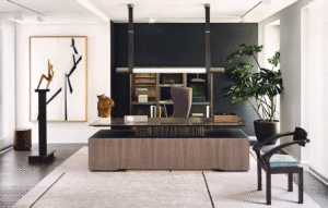 Структура стеллажа выполнена из деревянной панели с сотовым наполнением. Отделка — глянцевый или матовый лак, различные виды шпона дерева.